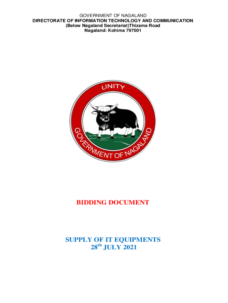 GOVERNMENT OF NAGALAND DIRECTORATE OF INFORMATION TECHNOLOGY AND COMMUNICATION (Below Nagaland Secretariat)Hiram Road Nagaland: Kolyma 797001BIDDING DOCUMENTSUPPLY OF IT EQUIPMENTS 28th JULY 2021GOVERNMENT