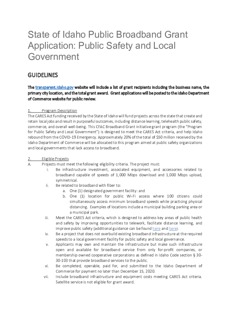 State of Idaho Public Broadband Grant Application: Public Safety and Local Government GUIDELINES The transparent.Idaho.gov website will include a list of grant recipients including the business name,