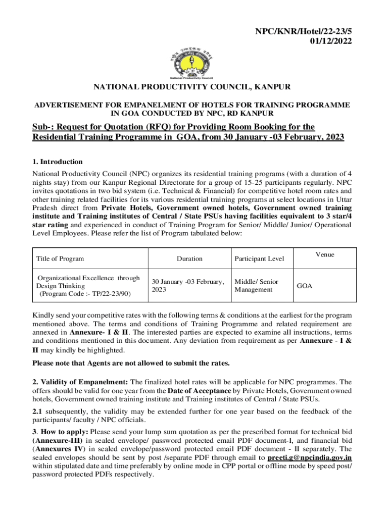NPC/CNR/Hotel/2223/5 01/12/2022NATIONAL PRODUCTIVITY COUNCIL, KANPUR ADVERTISEMENT FOR EMBANKMENT OF HOTELS FOR TRAINING Program IN GOA CONDUCTED BY NPC, RD Kanpur: Request for Quotation (RFQ) for