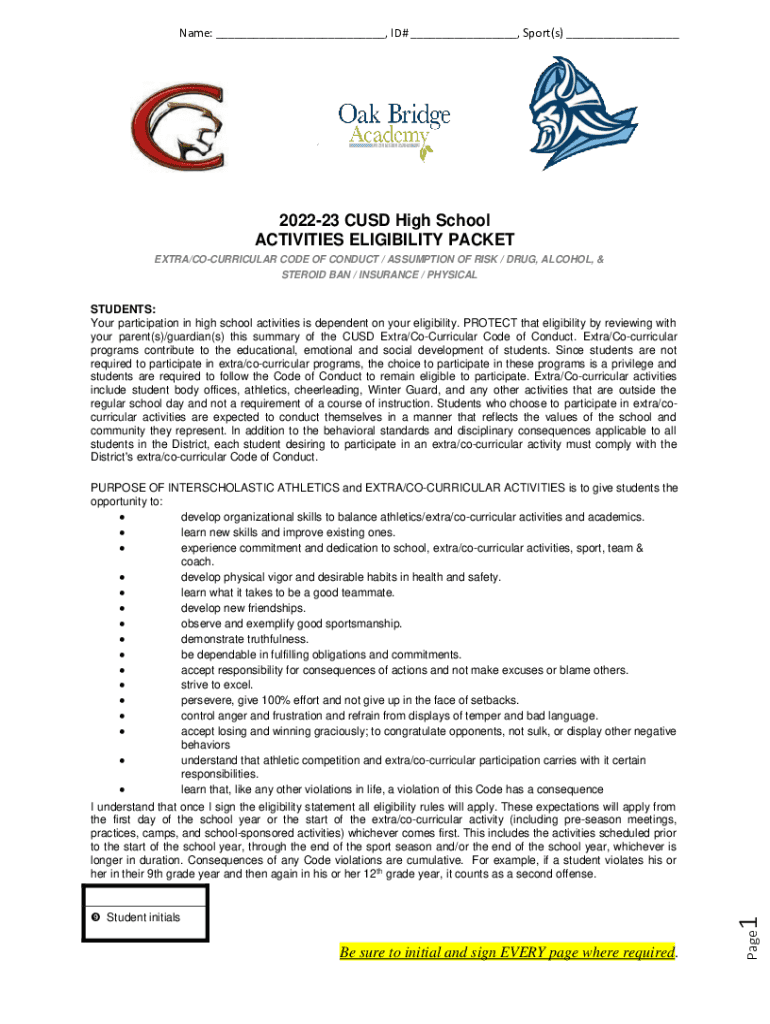 Name: ___, ID# ___, Sport(s) ___202223 CUSP High School ACTIVITIES ELIGIBILITY PACKET EXTRA/CURRICULAR CODE OF CONDUCT / ASSUMPTION OF RISK / DRUG, ALCOHOL, & STEROID BAN / INSURANCE / PHYSICALSTUDENTS: