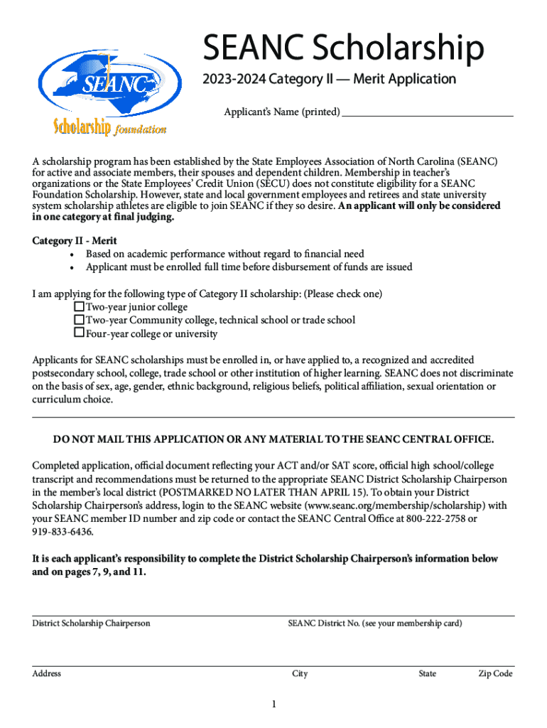 SEAN Scholarship 20232024 Category II Merit Application Applicants Name (printed)___A scholarship program has been established by the State Employees Association of North Carolina (SEAN) for active