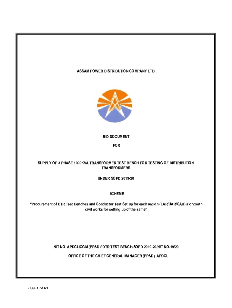 ASSAM POWER DISTRIBUTION COMPANY LTD.BID DOCUMENT SUPPLY OF 3 PHASE 1000KVA TRANSFORMER TEST BENCH FOR TESTING OF DISTRIBUTION TRANSFORMERS Undersold 201920SCHEME Procurement of DR Test Benches and