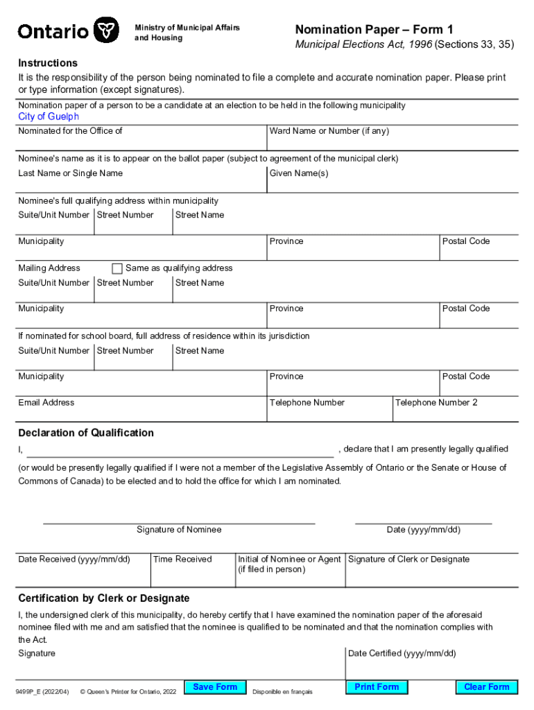 and HousingNomination Paper Form 1Municipal Elections Act, 1996 (Sections 33, 35)Instructions