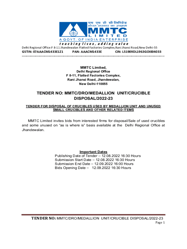 Delhi Regional Office:F 811 Jhandewalan Flatted Factories Complex, Ran Jhansi Road, New Delhi55GSTIN: 07AAACM1433E1Z1 PAN: AAACM1433E IN: L51909DL1963GOI004033 MTC Limited, Delhi Regional Office F