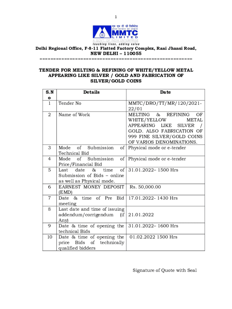 1Delhi Regional Office, F811 Flatted Factory Complex, Ran Jhansi Road, NEW DELHI 110055 TENDER FOR MELTING & REFINING OF WHITE/YELLOW METAL APPEARING LIKE SILVER / GOLD AND FABRICATION OF SILVER/GOLD