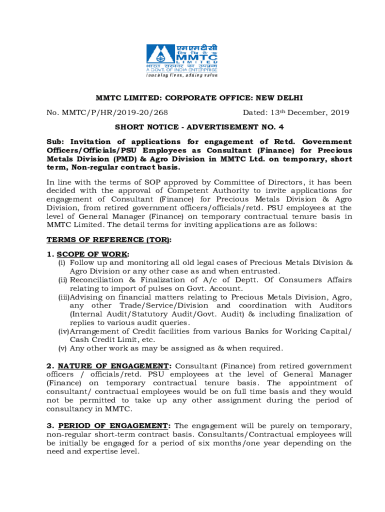 MTC LIMITED: CORPORATE OFFICE: NEW DELHI No. MTC/P/HR/201920/268Dated: 13th December, 2019SHORT NOTICE ADVERTISEMENT NO. 4 Sub: Invitation of applications for engagement of Red. Government Officers/Officials/PSU