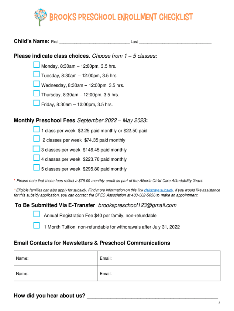 Return the completed form and documents to the Brooks Preschool office by the specified deadline