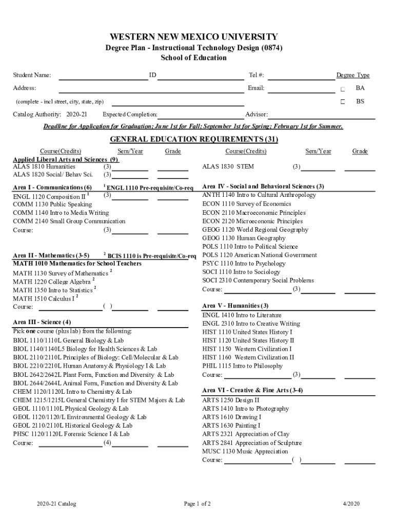WESTERN NEW MEXICO UNIVERSITYDegree Plan Instructional Technology Design (0874)