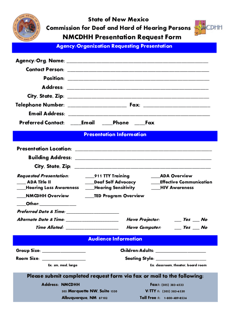 The nmcdhh presentation request form is a form used to request a presentation from the New Mexico Commission for Deaf and Hard of Hearing (NMCDHH).