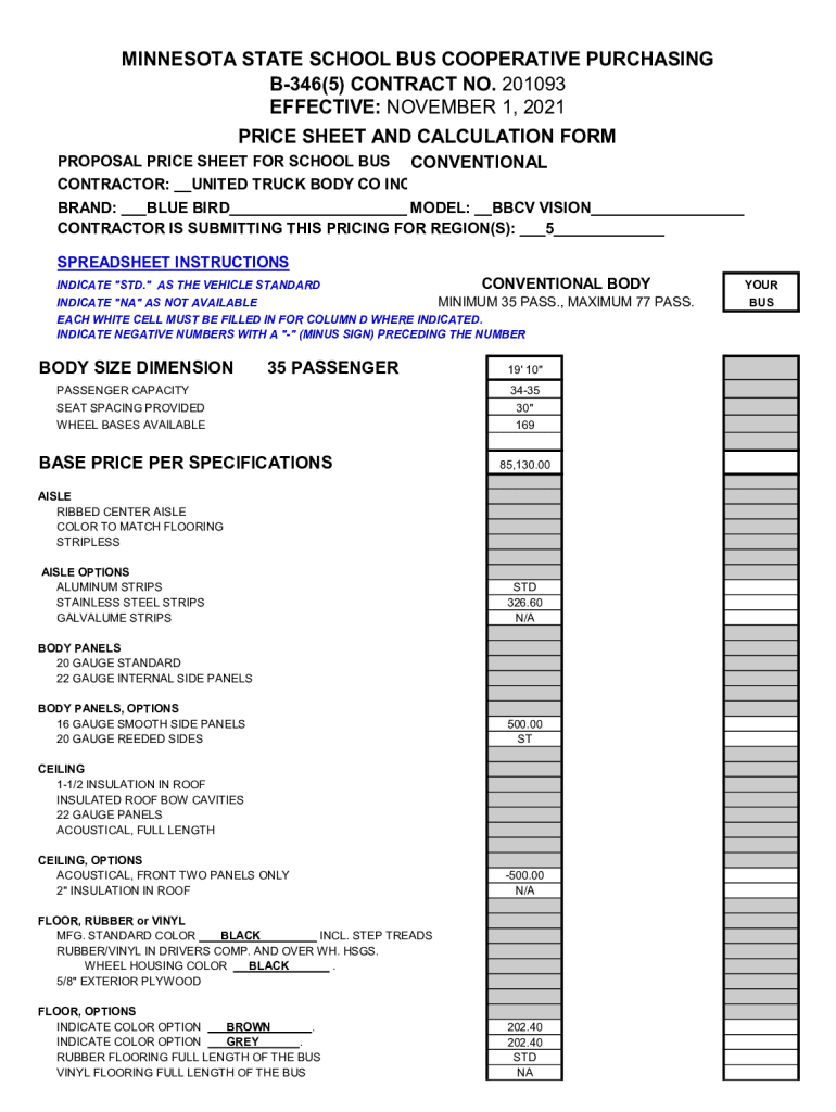 PRICE SHEET AND CALCULATION FORMPROPOSAL PRICE SHEET FOR SCHOOL BUS CONVENTIONAL