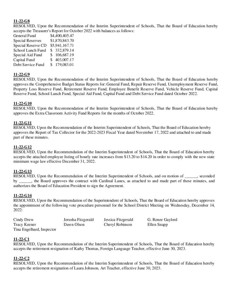 1122G8 RESOLVED, Upon the Recommendation of the Interim Superintendent of Schools, That the Board of Education hereby accepts the Treasurer\'s Report for October 2022 with balances as follows: General