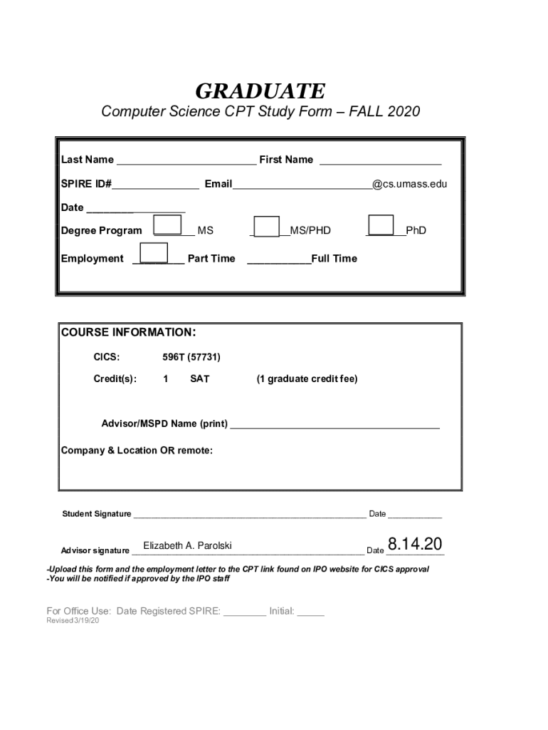 GRADUATE Computer Science CPT Study Form FALL 2020 Last Name ___ First Name ___ SPIRE ID#___ Email___@cs.umass.edu Date ___ Degree Program___ Employment ___ Part Time___MS/PhD___PhD___Full Telecourse