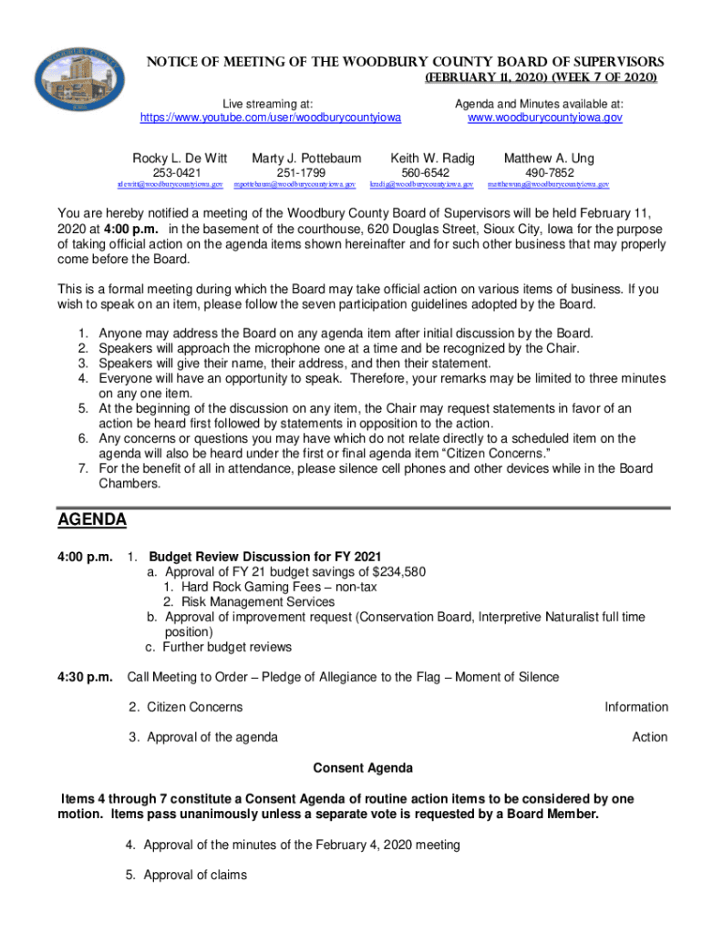 NOTICE OF MEETING OF THE WOODBURY COUNTY BOARD OF SUPERVISORS (FEBRUARY 11, 2020) (Week 7 of 2020) Live streaming at: https://www.youtube.com/user/woodburycountyiowaRocky L. De Witt Marty J. Pottebaum2530421
