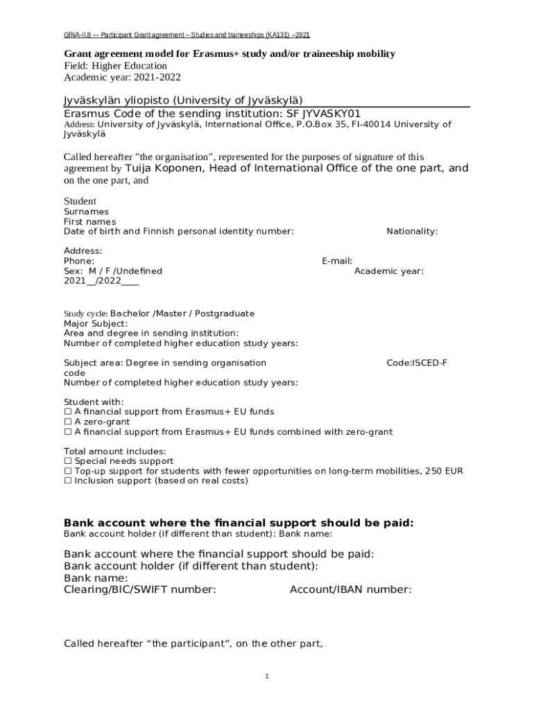 What is Grant agreement model for Erasmus+ studies and/or ... - WUR Form?