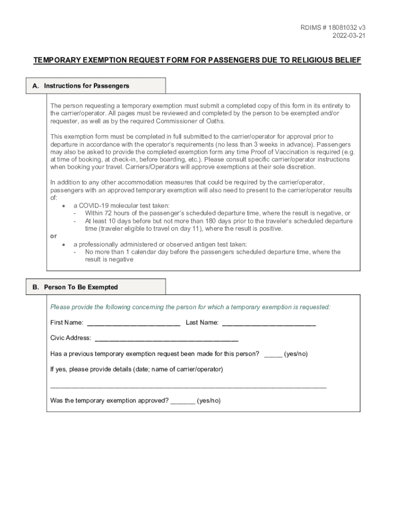 RIMS # 18081032 v3 20220321TEMPORARY EXEMPTION REQUEST FORM FOR PASSENGERS DUE TO RELIGIOUS BELIEF A. Instructions for Passengers The person requesting a temporary exemption must submit a completed
