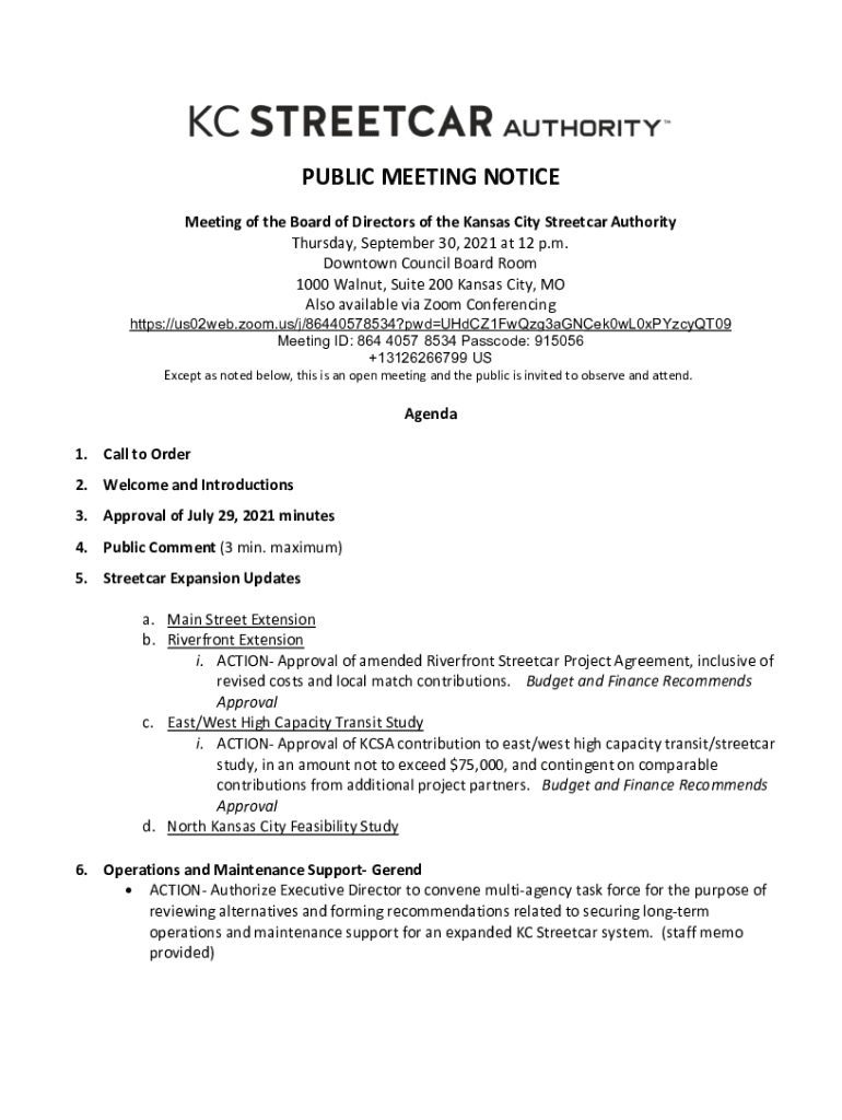 PUBLIC MEETING NOTICE Meeting of the Board of Directors of the Kansas City Streetcar Authority Thursday, September 30, 2021, at 12 p.m. Downtown Council Board Room 1000 Walnut, Suite 200 Kansas City,