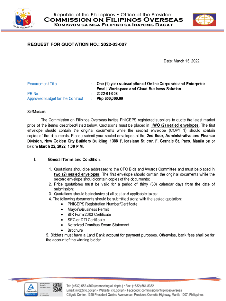 REQUEST FOR QUOTATION NO.: 202203007Date: March 15, 2022Procurement Title PR No. Approved Budget for the Contract: One (1) year subscription of Online Corporate and Enterprise Email, Workspace and