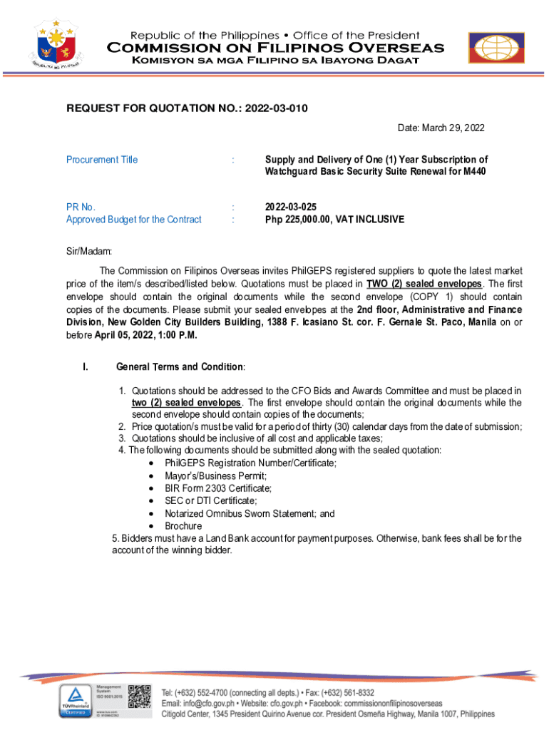 REQUEST FOR QUOTATION NO.: 202203010 Date: March 29, 2022, Procurement Title:Supply and Delivery of One (1) Year Subscription of Watch guard Basic Security Suite Renewal for M440PR No. Approved Budget