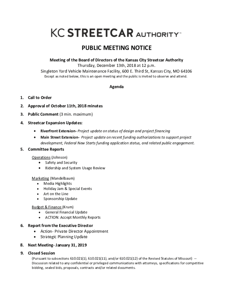 PUBLIC MEETING NOTICE Meeting of the Board of Directors of the Kansas City Streetcar Authority Thursday, December 13th, 2018 at 12 p.m. Singleton Yard Vehicle Maintenance Facility, 600 E. Third St,