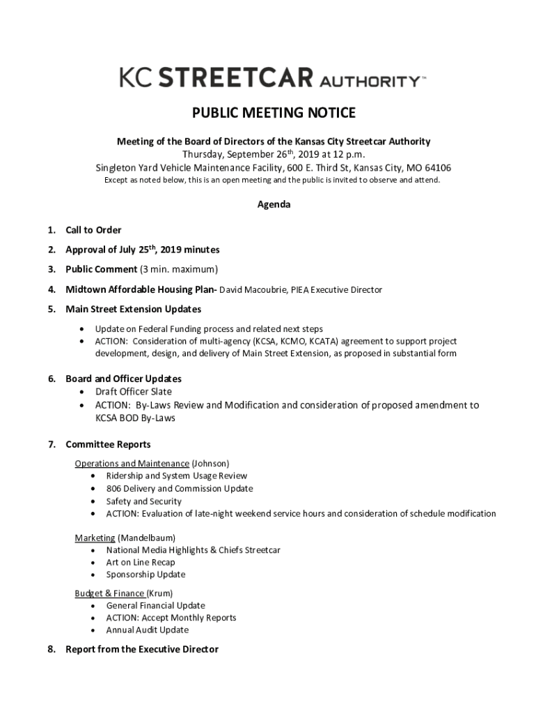 PUBLIC MEETING NOTICE Meeting of the Board of Directors of the Kansas City Streetcar Authority Thursday, September 26th, 2019 at 12 p.m. Singleton Yard Vehicle Maintenance Facility, 600 E. Third St,