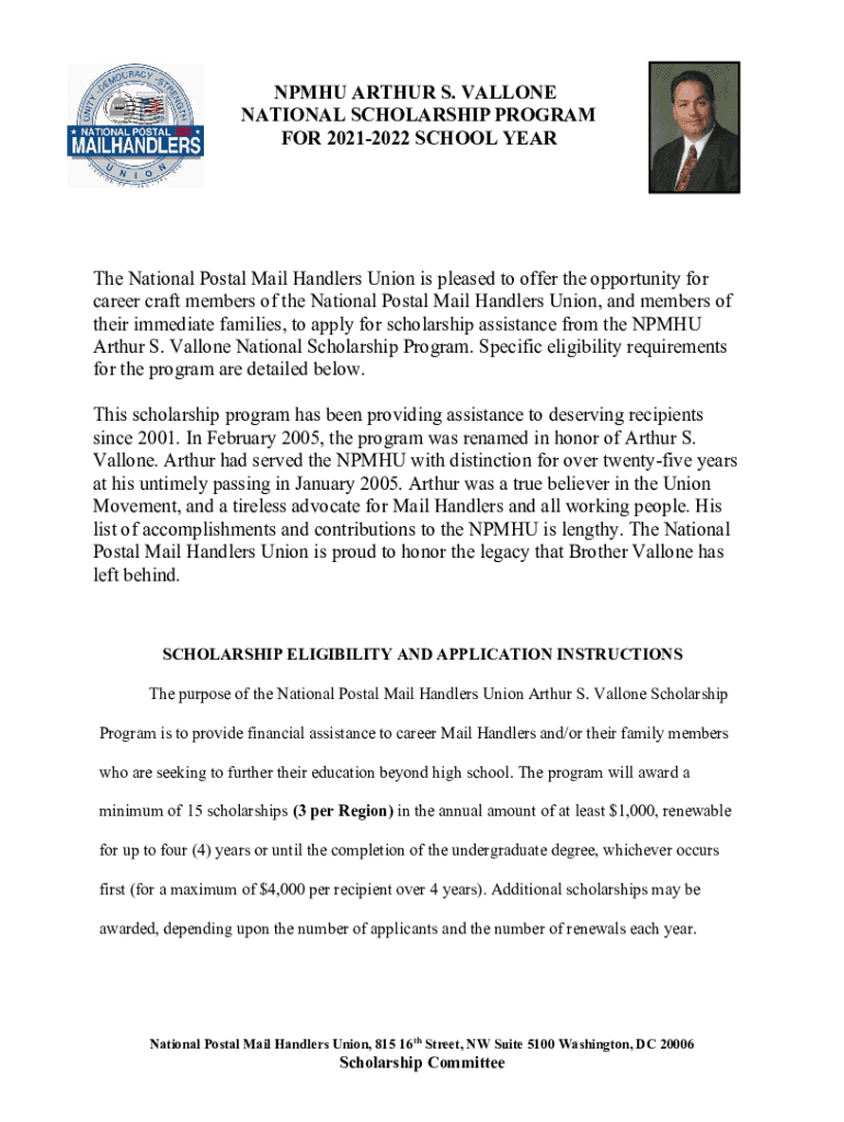 PMH ARTHUR S. ALONE NATIONAL SCHOLARSHIP PROGRAM FOR 20212022 SCHOOL Earth National Postal Mail Handlers Union is pleased to offer the opportunity for career craft members of the National Postal Mail