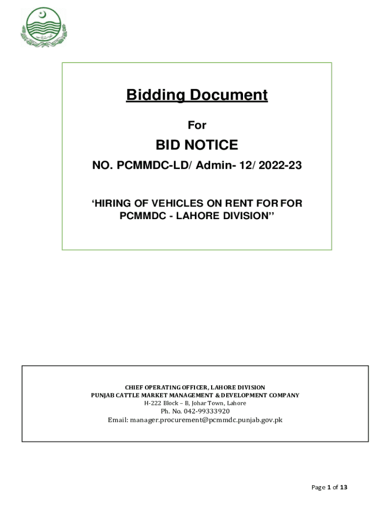 Bidding Document Forbid NOTICE NO. PCMMDCLD/ Admin 12/ 202223 HIRING OF VEHICLES ON RENT FOR PCM MDC LAHORE DIVISIONCHIEF OPERATING OFFICER, LAHORE DIVISION PUNJAB CATTLE MARKET MANAGEMENT & DEVELOPMENT