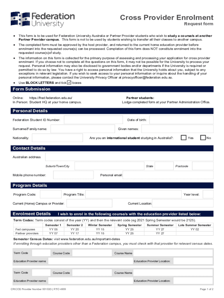 Cross Provider Enrollment Request from This form is to be used for Federation University Australia or Partner Provider students who wish to study a course/s at another Partner Provider campus. This