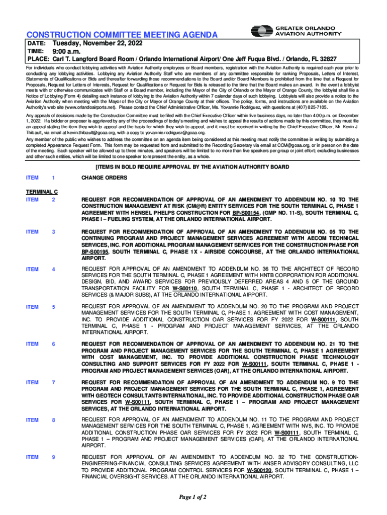 CONSTRUCTION COMMITTEE MEETING AGENDA DATE: Tuesday, November 22, 2022, TIME: 9:00 a.m. PLACE: Carl T. Langford Board Room / Orlando International Airport/ One Jeff Aqua Blvd. / Orlando, FL 32827