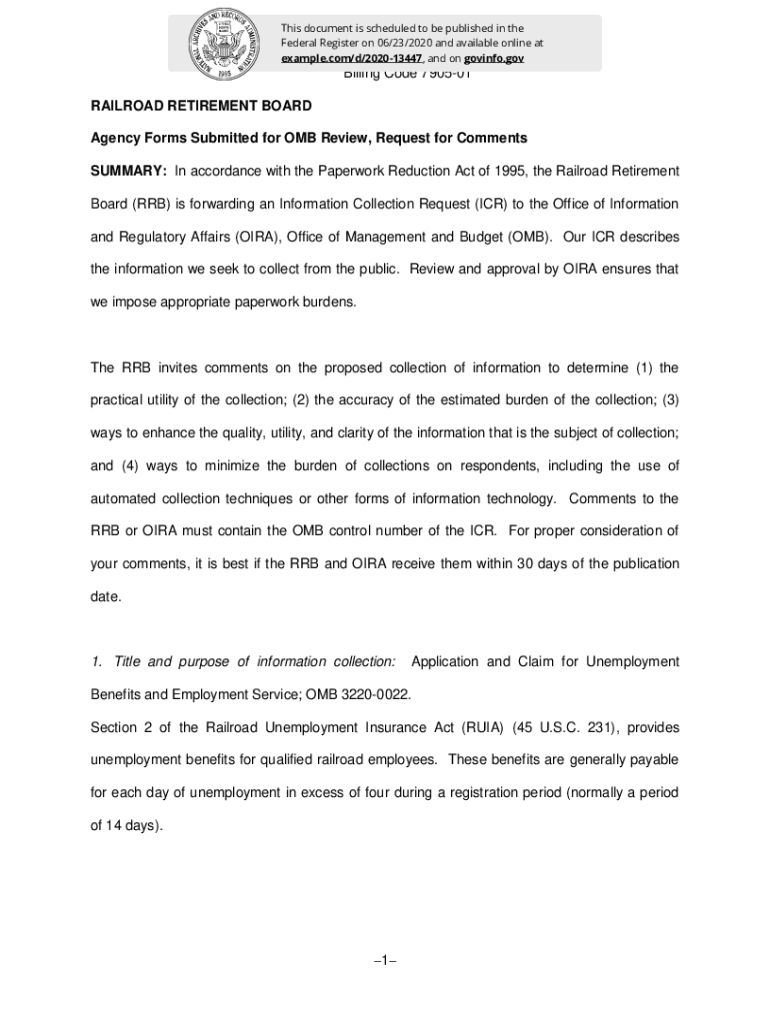 This document is scheduled to be published in the Federal Register on 06/23/2020 and available online at example.com/d/202013447, and on gov info. Billing Code 790501 RAILROAD RETIREMENT BOARD Agency