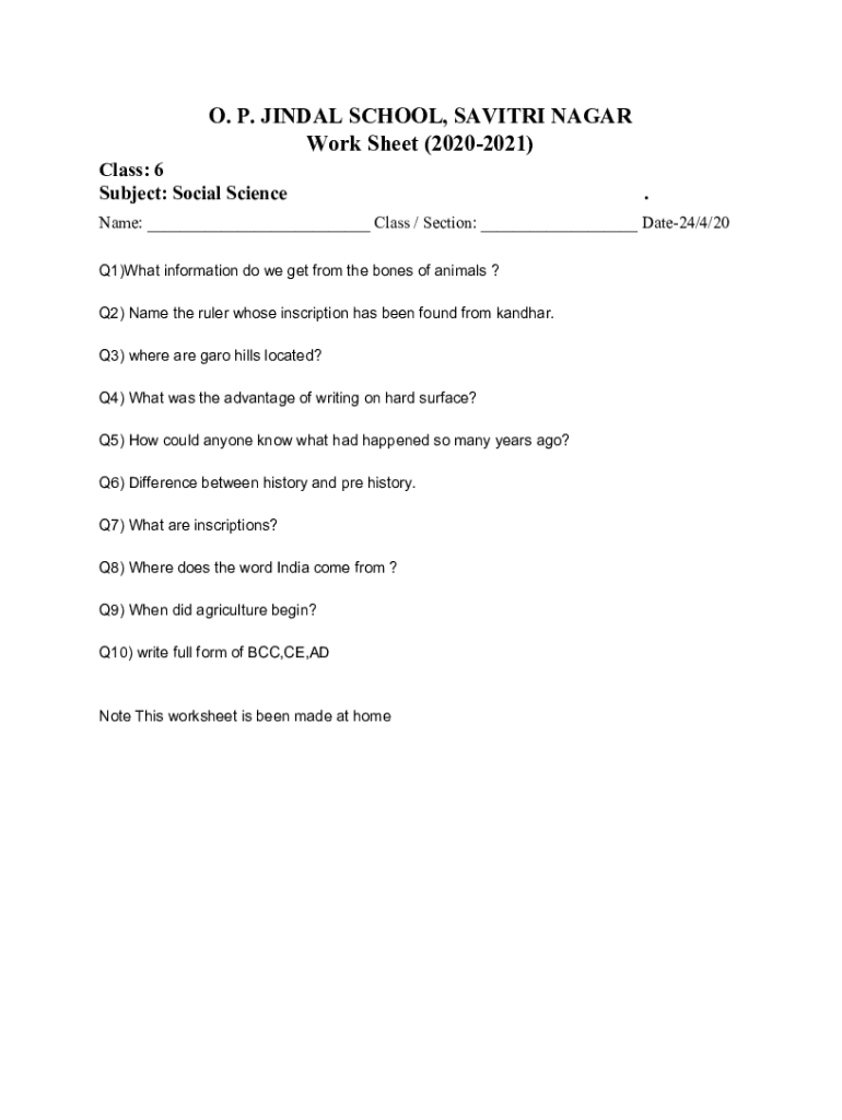 O. P. FINAL SCHOOL, SAVITṚ NAGAR Work Sheet (20202021) Class: 6 Subject: Social Science. Name: ___ Class / Section: ___ Date24/4/20 Q1)What information do we get from the bones of animals ? Q2)