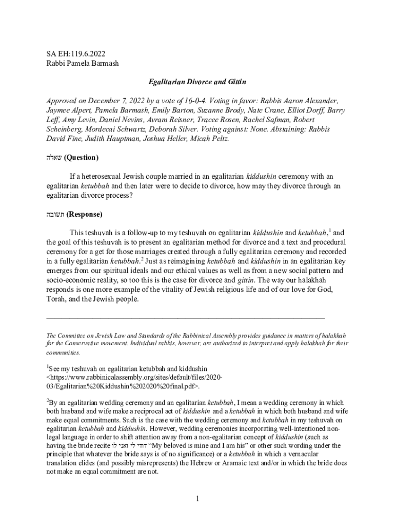 SA EH:119.6.2022 Rabbi Pamela Bar mash Egalitarian Divorce and Git tin Approved on December 7, 2022, by a vote of 1604. Voting in favor: Rabbis Aaron Alexander, Jaycee Alpert, Pamela Bar mash, Emily