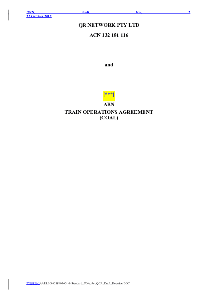 URN 25 October 2012draftNo.QR NETWORK PTY LTD ACN 132 181 116and[***] ABN TRAIN OPERATIONS AGREEMENT (COAL)7708426/3AARLEG#21840365v1Standard_TOA_for_QCA_Draft_Decision.DOC22THIS AGREEMENT is made