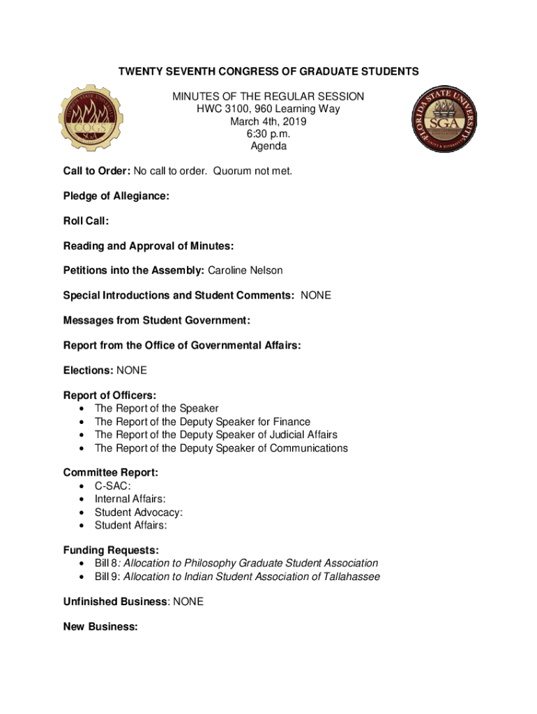TWENTY SEVENTH CONGRESS OF GRADUATE STUDENTS MINUTES OF THE REGULAR SESSION HOC 3100, 960 Learning Way March 4th, 2019 6:30 p.m. Agenda Call to Order: No call to order. Quorum not met. Pledge of Allegiance: