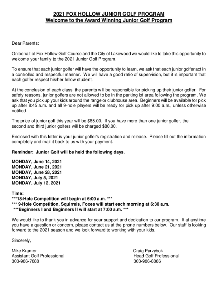 2021 FOX HOLLOW JUNIOR GOLF PROGRAM Welcome to the Award Winning Junior Golf Programmer Parents: On behalf of Fox Hollow Golf Course and the City of Lakewood we would like to take this opportunity