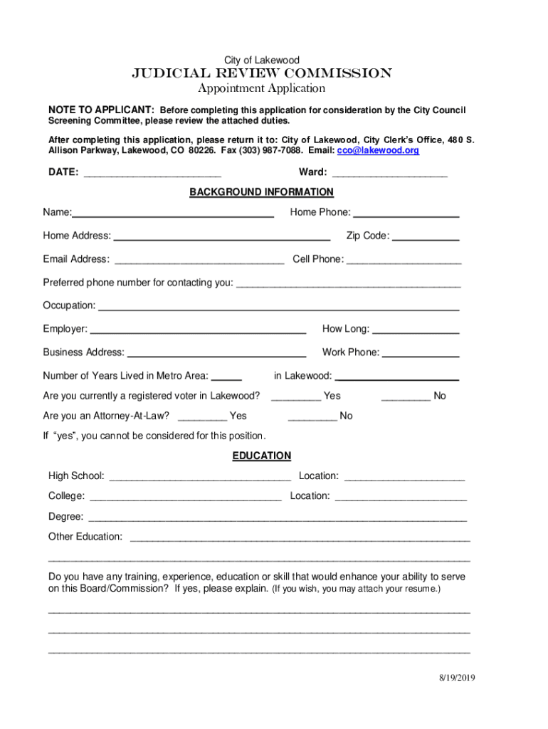 City of LakewoodJUDICIAL REVIEW COMMISSION Appointment Application NOTE TO APPLICANT: Before completing this application for consideration by the City Council Screening Committee, please review the