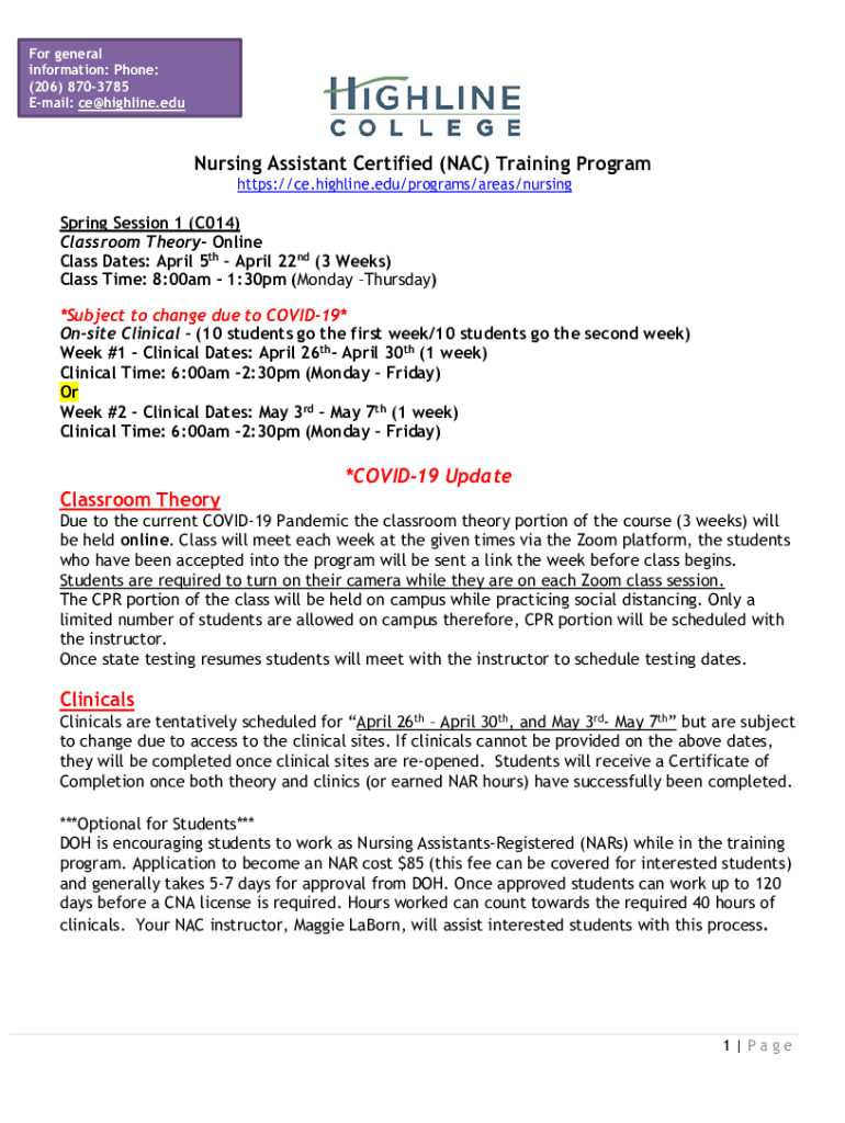 For general information: Phone: (206) 8703785 Email: ce@highline.eduNursing Assistant Certified (NAC) Training Program https://ce.highline.edu/programs/areas/nursingSpring Session 1 (C014) Classroom