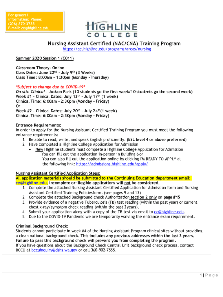 For general information: Phone: (206) 8703785 Email: ce@highline.eduNursing Assistant Certified (NAC/CNA) Training Program https://ce.highline.edu/programs/areas/nursingSummer 2020 Session 1 (C011)