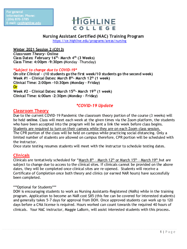 For general information: Phone: (206) 8703785 Email: ce@highline.eduNursing Assistant Certified (NAC) Training Program https://ce.highline.edu/programs/areas/nursingWinter 2021 Session 2 (C013) Classroom