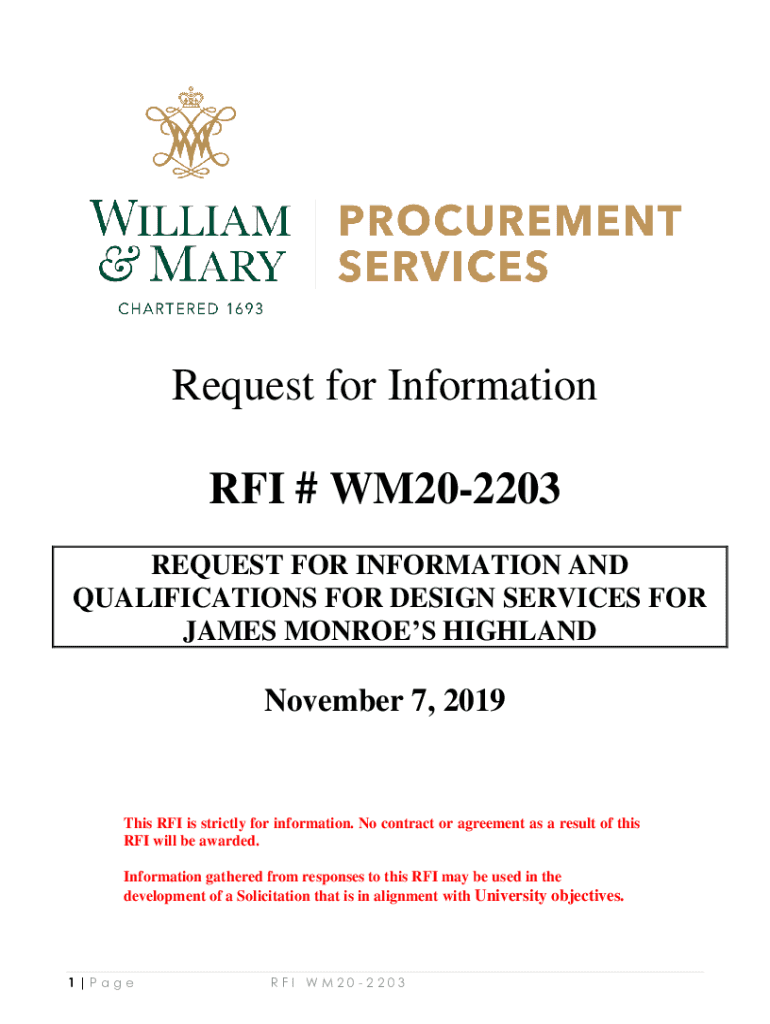 Request for Information RFI # WM202203 REQUEST FOR INFORMATION AND QUALIFICATIONS FOR DESIGN SERVICES FOR JAMES MONROE HIGHLAND November 7, 2019This RFI is strictly for information. No contract or