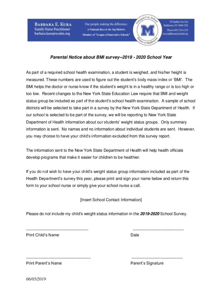 Parental Notice about BMI survey2019 2020 School Years part of a required school health examination, a student is weighed, and his/her height is measured. These numbers are used to figure out the