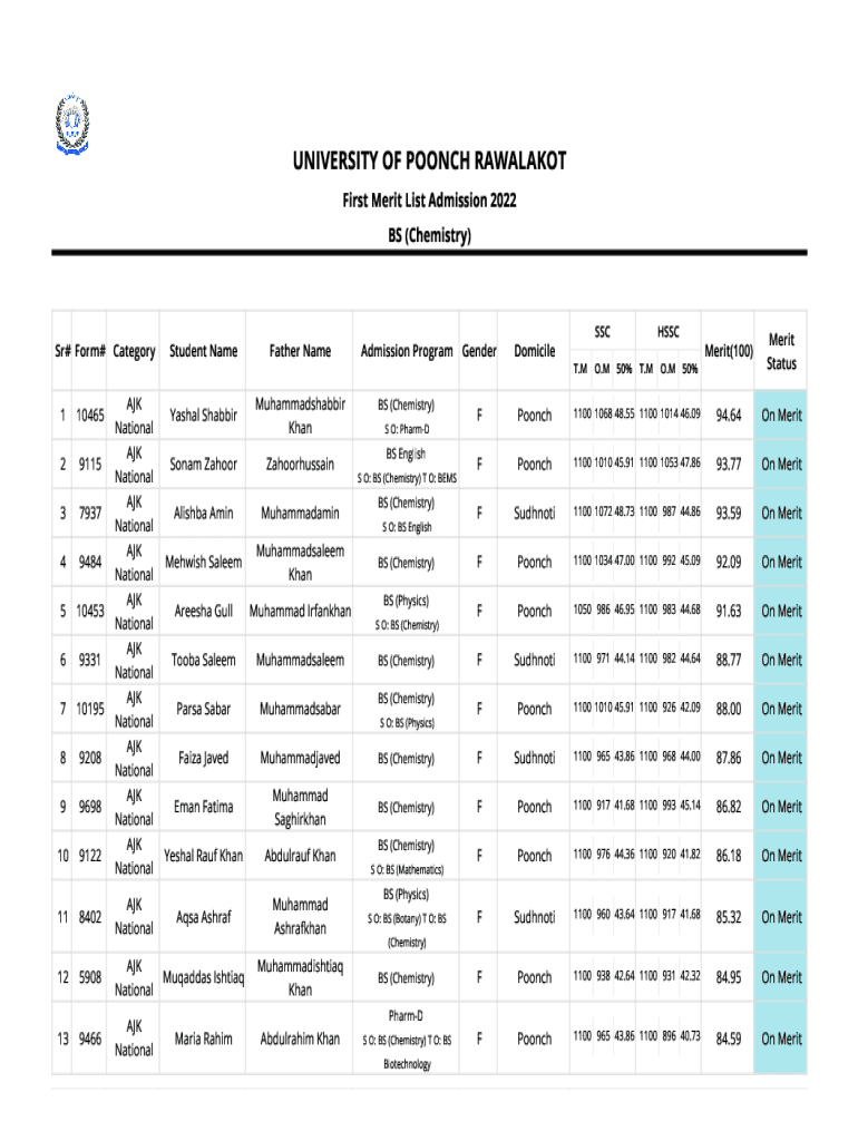 BS (Chemistry)Sr# Form# CategoryStudent Name Father Name AJK