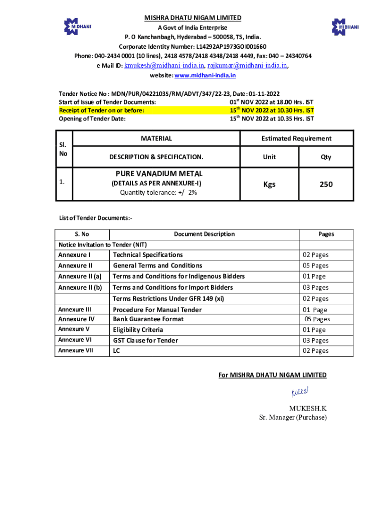 MISHRA DH ATU NI GAM LIMITED A Govt of India Enterprise P. O Kanchanbagh, Hyderabad 500058, TS, India. Corporate Identity Number: L14292AP1973GOI001660 Phone: 0402434 0001 001 (10 lines), 2418 4578/2418