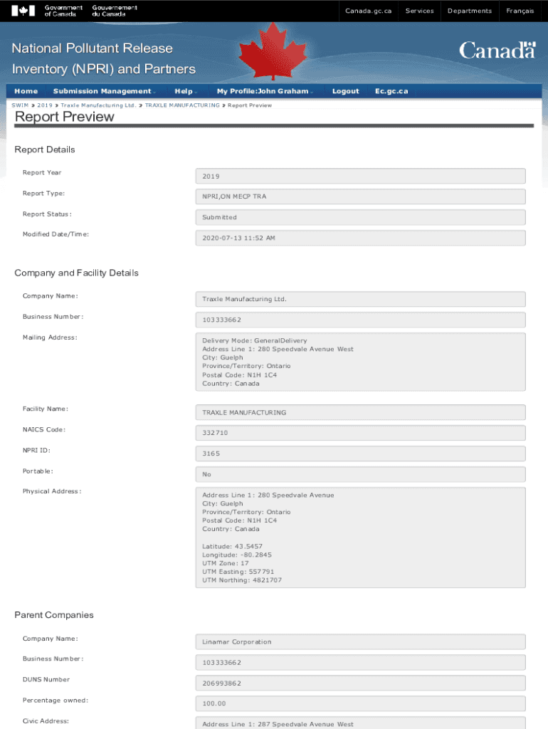 Canada.GC.caServicesNational Pollutant Release Inventory (NPR) and Partners Home SWIMSubmission Management2019Traxle Manufacturing Ltd. Help Profile:John GrahamTRAXLE MANUFACTURINGLogoutReport PreviewReport