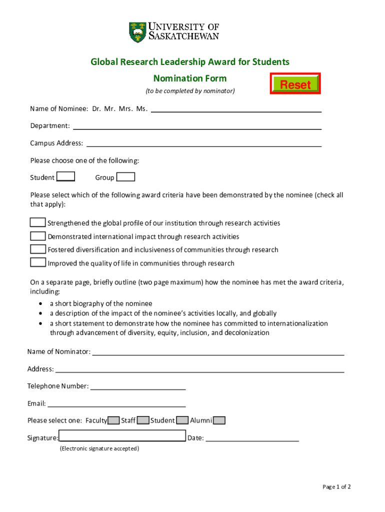 Global Research Leadership Award for Students Nomination Form (to be completed by nominator)Rename of Nominee: Dr. Mr. Mrs. Ms. Department: Campus Address: Please choose one of the following: Student