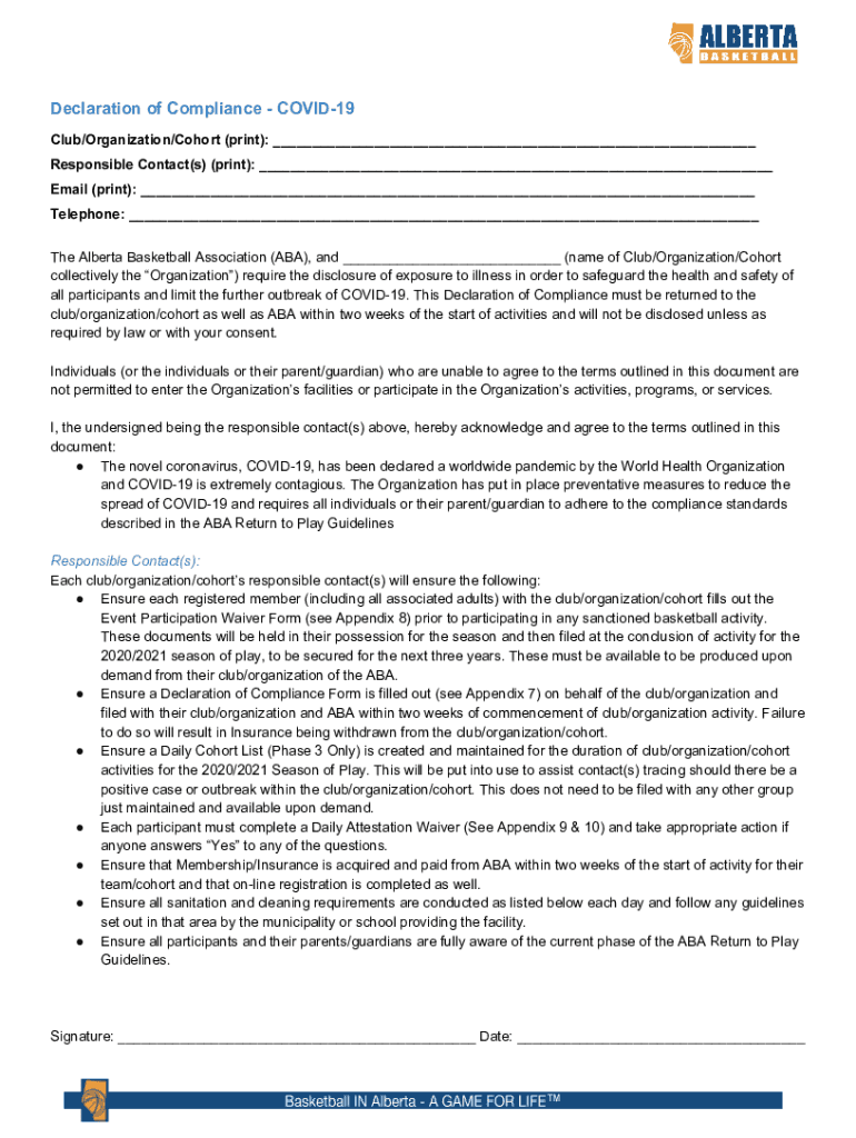 Declaration of Compliance COVID-19 Club/Organization/Cohort (print): ___ Responsible Contact(s) (print): ___ Email (print): ___ Telephone: ___ The Alberta Basketball Association (ABA), and ___ (name