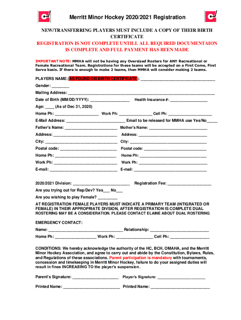Merritt Minor Hockey 2020/2021 Registration NEW/TRANSFERRING PLAYERS MUST INCLUDE A COPY OF THEIR BIRTH CERTIFICATE REGISTRATION IS NOT COMPLETE UNTIL ALL REQUIRED DOCUMENTATION IS COMPLETE AND FULL