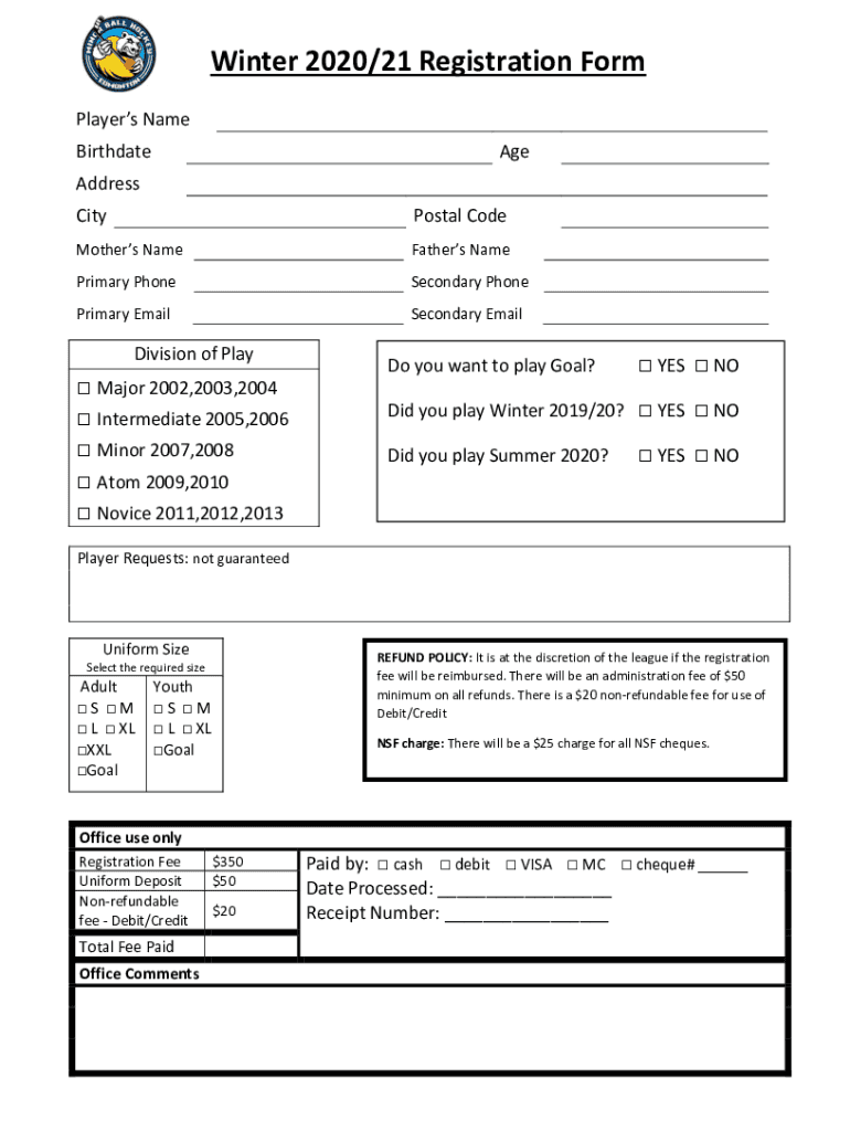Winter 2020/21 Registration Form Players Name BirthdateAgeAddress CityPostal Godmothers Name Fathers Preprimary Postsecondary Preprimary EmailSecondary EmailDivision of Play Major 2002,2003,2004 Intermediate