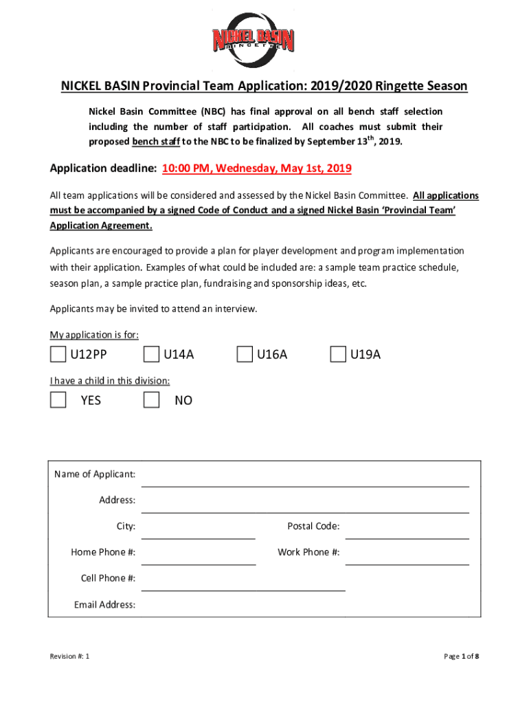 NICKEL BASIN Provincial Team Application: 2019/2020 Ringette Season Nickel Basin Committee (NBC) has final approval on all bench staff selection including the number of staff participation. All coaches