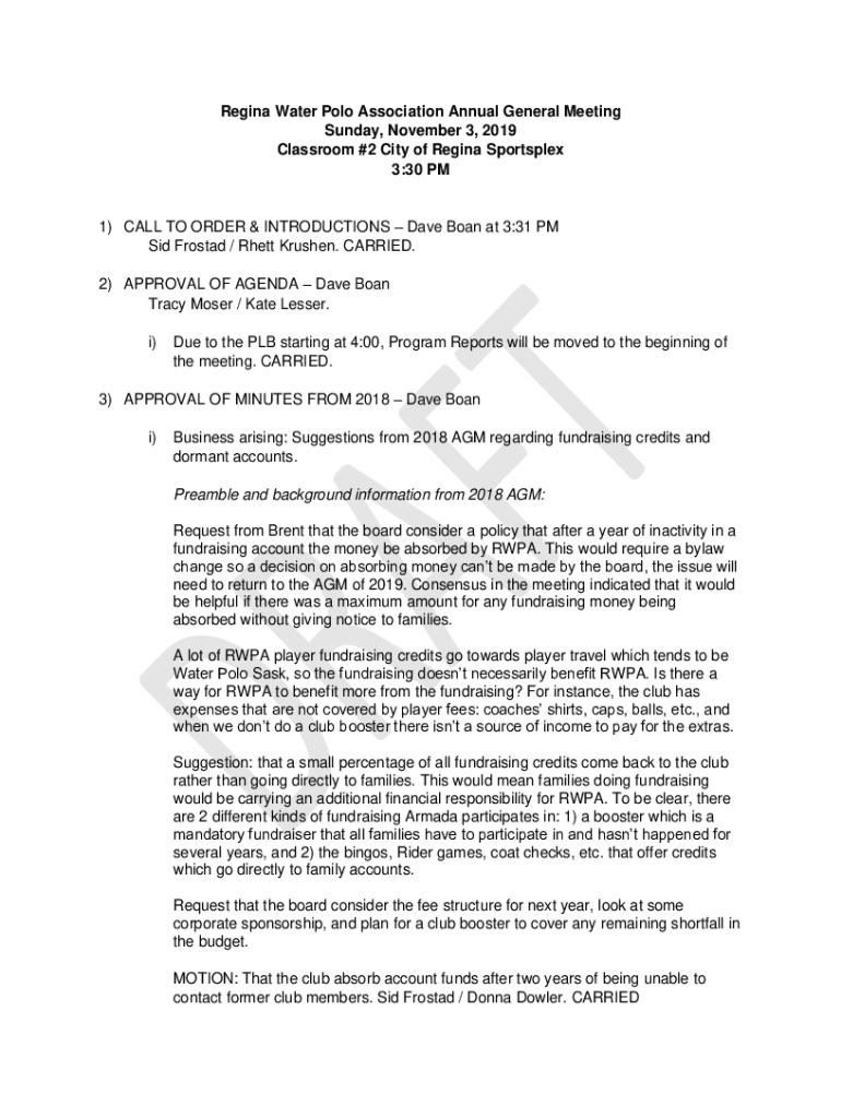 Regina Water Polo Association Annual General Meeting Sunday, November 3, 2019, Classroom #2 City of Regina Sportsmen 3:30 PM1) CALL TO ORDER & INTRODUCTIONS Dave Born at 3:31 PM Sid Frosted / Rhett