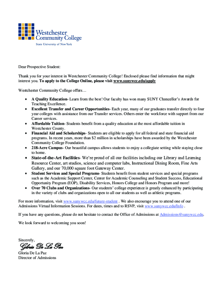Dear Prospective Student: Thank you for your interest in Westchester Community College! Enclosed please find information that might interest you. To apply to the College Online, please visit www.sunywcc.edu/apply